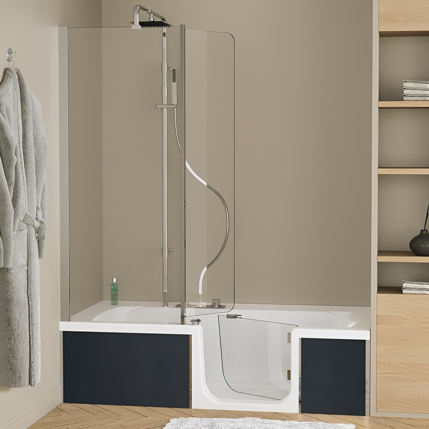 Baignoire à porte sur châssis métal, normes handicapé DUO Pack Design 170x75 pose en niche espace douche à gauche tête à droite tablier inclus. Porte d'accès en verre (8 mm) à ouverture intérieure, Pare-bain en verre (6 mm) traité anticalcaire, Robinetterie à mitigeur thermostatique. Vidage, mitigeur, cascade, douchette à main, barre de douche avec douche pluie inclus. Pack Design 2 : tabliers en panneaux découpables Kinewall Design gris anthracite. Garantie : 2 ans. Code EAN : 3660426097830. Référence : BKDD77TDTSNNG. Fabrication à la demande, marchandise ni reprise, ni échangée. Tabliers en panneaux découpables Kinewall Design gris anthracite