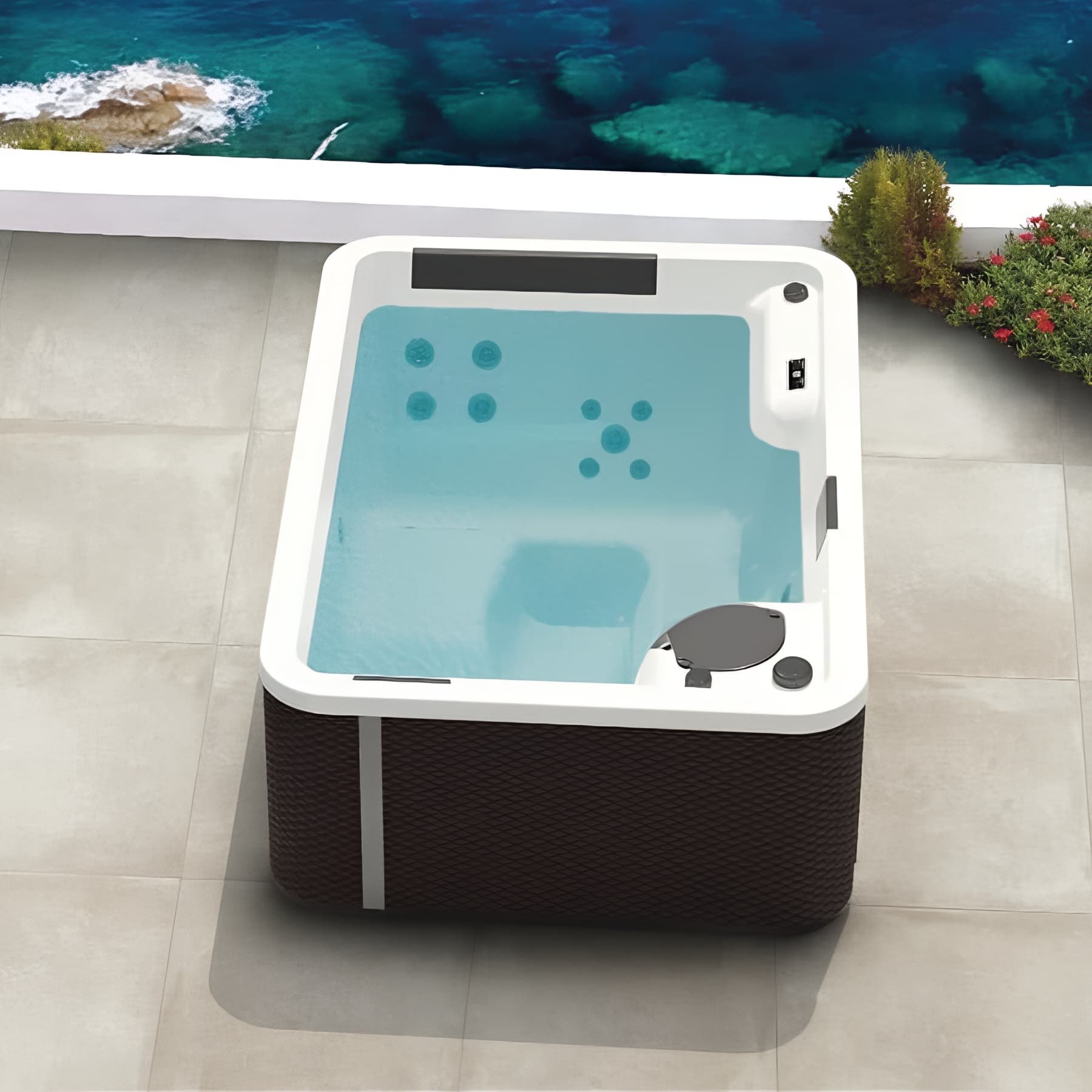Happy Spa 6 places coque blanche livré avec tablier BOIS FONCE couverture thermique et chromothérapiePrix Spécial 12 490,90 € Prix normal 16 112,40 €